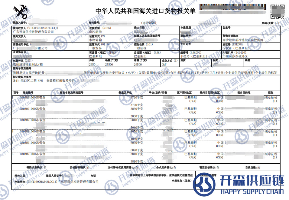 【本文結(jié)語】 上述就是巴基斯坦凍帶魚進(jìn)口報(bào)關(guān)清關(guān)代理服務(wù)【經(jīng)典案例】的全部內(nèi)容,希望能對(duì)您有所幫助,如有水產(chǎn)品進(jìn)口報(bào)關(guān)上任何疑問及問題可隨時(shí)在線聯(lián)系我們或撥打 18002611553,開森供應(yīng)鏈擁有豐富的水產(chǎn)品進(jìn)口報(bào)關(guān)操作經(jīng)驗(yàn)及案例,10余年進(jìn)口經(jīng)驗(yàn)為您所用,各類進(jìn)口疑難都能為您一一解答及協(xié)助快速處理解決!