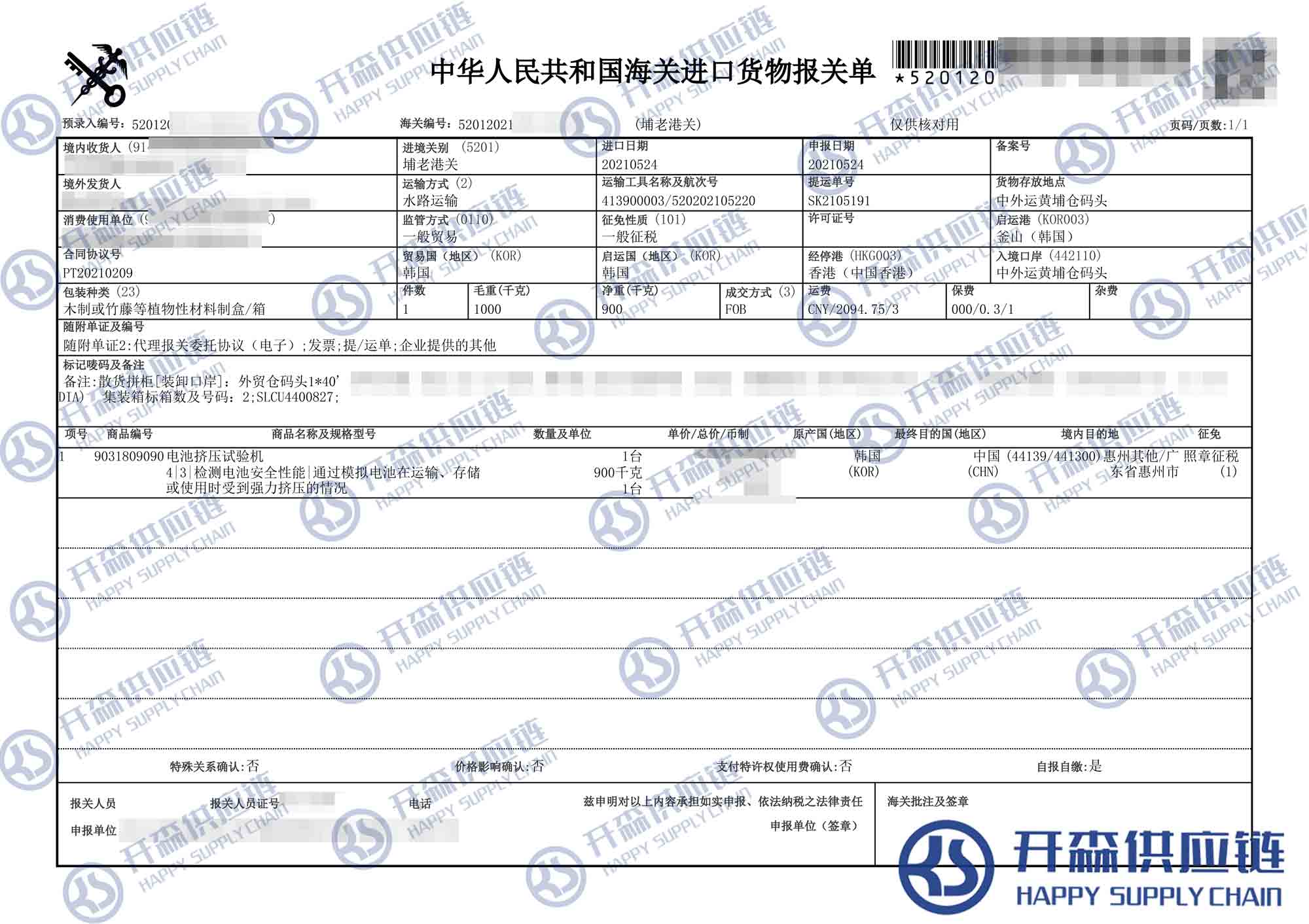 【導讀】您正在閱讀的是關(guān)于韓國電池擠壓試驗機進口報關(guān)代理服務(wù)【進口案例】的內(nèi)容,本文由開森機械進口報關(guān)代理小編整理編寫;