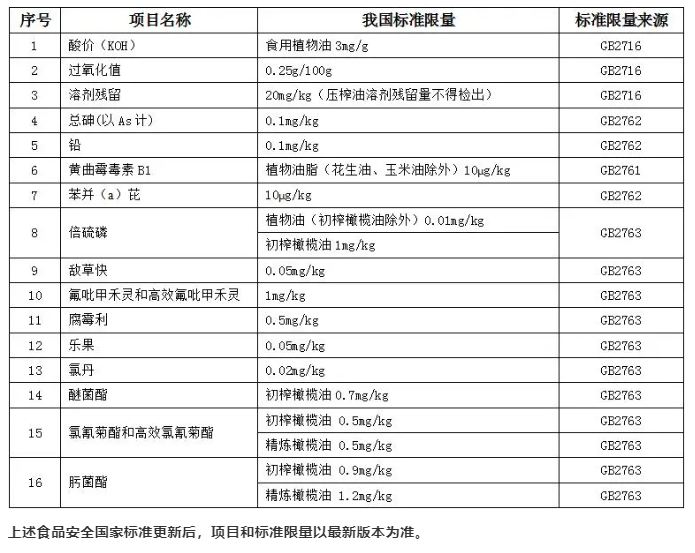 進口食用橄欖油食品安全衛生指標應該符合現行的GB2716《食品安全國家標準植物油》、GB2761《食品安全國家標準食品中真菌毒素限量》、GB2762《食品安全國家標準食品中污染物限量》和GB2763《食品安全國家標準食品中農藥最大殘留限量》等,現將部分相關衛生指標和強制指標梳理如下: